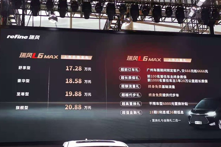 2020广州车展:瑞风L6 MAX售17.28万起