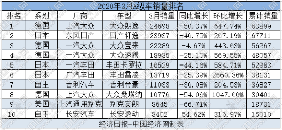 3月,A级车累计销售28.36万辆,环比增长近4倍,各车型实现全面复苏。其中,前十车型环比均大幅增长,朗逸、速腾、卡罗拉、雷凌以及桑塔纳增幅甚至在5倍以上。