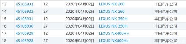 从图片来看,丰田在国内为全新雷克萨斯NX车型申请了NX 260、NX350H和NX400H+三个商标。参考海外已经曝光的信息来看,全新雷克萨斯NX 260将搭载2.5L自然吸气发动机,最大功率或达209马力;全新雷克萨斯NX 350H或采用2.5L混动系统,系统综合最大功率可达222马力。